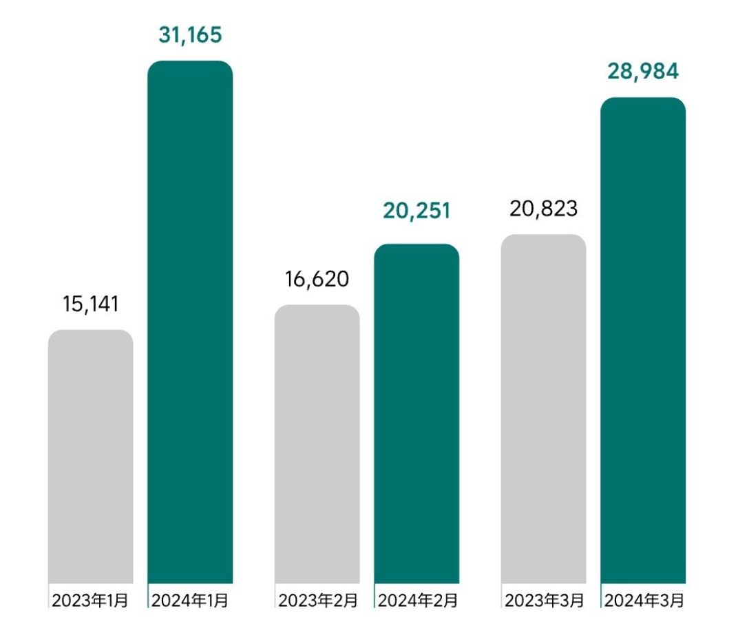 具体来看,王朝家族、海洋网是集团的绝对销量主力,3月共售出了286712辆,环比增长151.4%;腾势的环比增长也超过了100%,仰望汽车和方程豹汽车定位中高端市场,但得益于市场需求的平稳增长,分别有39.7%和53.7%的环比增长。