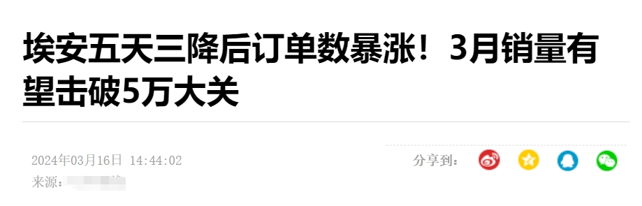 为了刺激销量增长,广汽埃安在3月份推出了相应的优惠政策,并且官方表示在3月11日获得了将近1600辆的订单量,当时甚至有媒体预测广汽埃安的3月份销量有望突破五万辆。