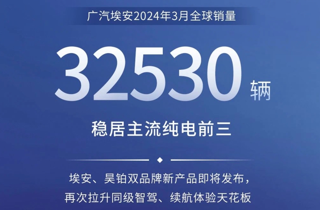 广汽埃安在3月份共售出32530辆,环比增长95.1%,这一数据虽然相比去年下半年四万辆左右的月销量水准,但也算处于平稳增长状态。