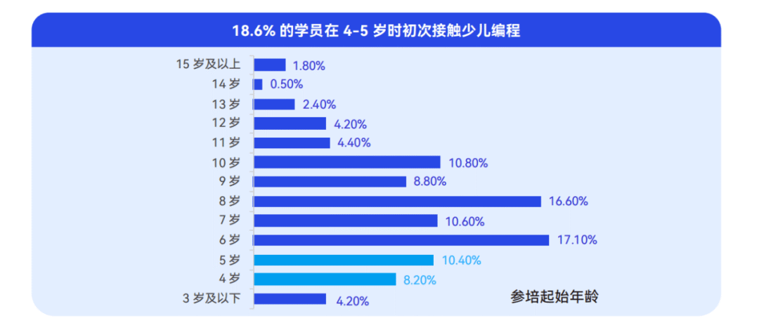 受义务教育阶段信息技术课程及科技教育影响,在小学阶段,学员年龄越低,参培意愿越高,有18.6%的学员在4-5岁时初次接触少儿编程。超7成家长将少儿编程视为培养思维拓展能力的一种方式,统计显示,已经长期接触少儿编程的用户家长对该培训粘性更高。