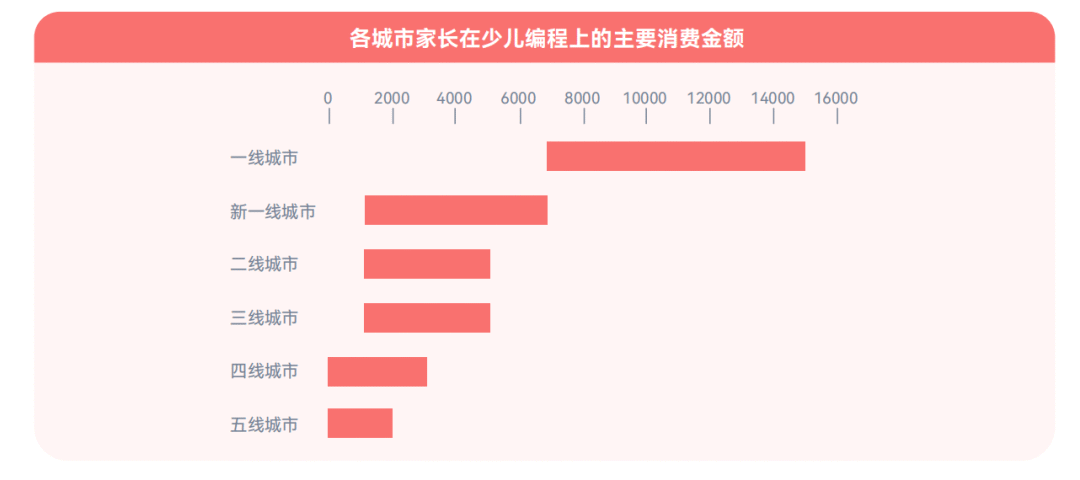 随着社会经济的发展和家庭收入的提高,家长对于孩子的教育投入不断增加。一年之中,超6成家长少儿编程教育投入在1000-7000元。15.7%家庭年花费在万元以上,其中超60%家庭生活在一线或新一线城市。虽然互联网发展迅速,在线教育日渐完善,但在四五线城市中,近半数家长对少儿编程认知度较低,并不了解何为少儿编程,且没有机会接触合适培训机构。