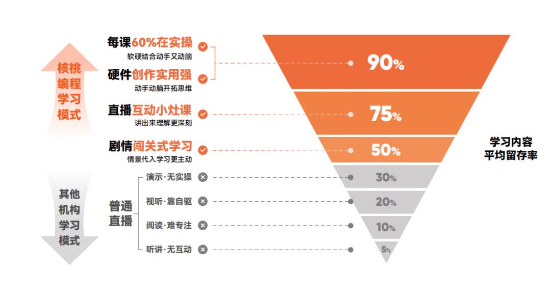 一般而言,一套合格且优质的少儿编程课程从立项到研发再到最终落地,大约需要一到两年的时间周期。据核桃编程内部调研数据显示,课程实操互动的占比与孩子学习吸收的情况呈正相关。例如,在实操互动内容达到60%的情况下,孩子学习内容的平均留存率就可达到75%左右。反之,如果孩子动手实操的内容占比低于50%,那么学习效果将难以保障。