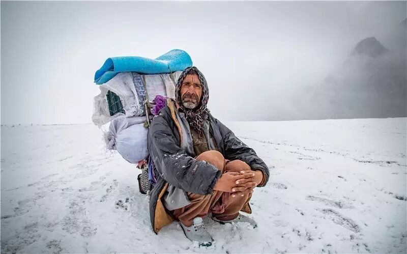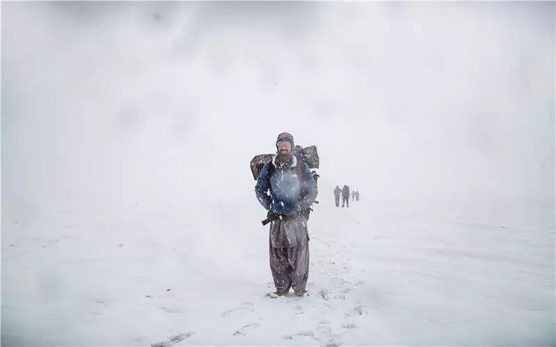 我为了拍摄背夫翻越垭口,足足在垭口等待了两个小时,等最后一个背夫翻过垭口时,天已经亮了。垭口上寒冷无比,至少有零下十几度,操作相机时我都不敢脱下手套。然而背夫们依旧穿着一身单薄的巴基斯坦民族服装—夏瓦儿卡米兹。