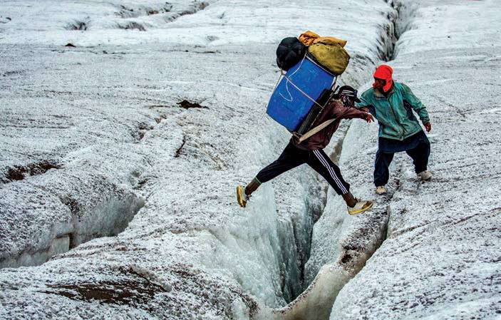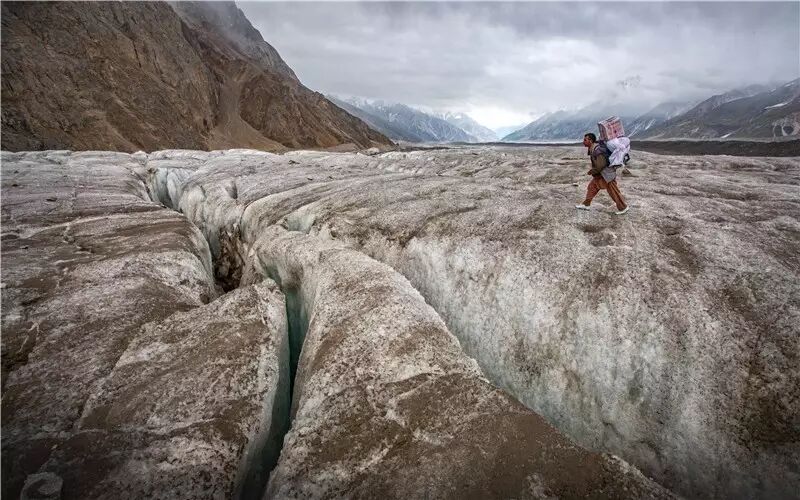 厨师纳比真在跨越一条冰裂缝。从 Baltistan 到 Hunza 山谷要穿越比阿佛(Biafo)冰川,这长达63公里的冰川和Hispar冰川共同组成了除极地之外世界上最长的冰川系统。