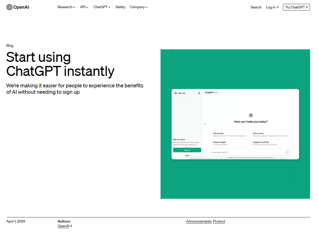 当地时间4月1日,OpenAI在官网发布公告称,将允许用户无需注册直接使用ChatGPT。该功能已于当日开始逐步推出,覆盖185个国家和地区的超1亿用户。