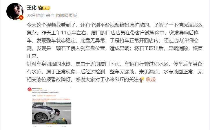 针对网传小米SU7试驾车发现异响和漏液一事,小米王化4月2日在微博回应称,异响系一颗石子侵入刹车盘位置造成,将石子取出后,异响消除,恢复正常。车身四周的水迹,是车辆有行驶过积水区,停车后车身留有水迹,属于正常现象。