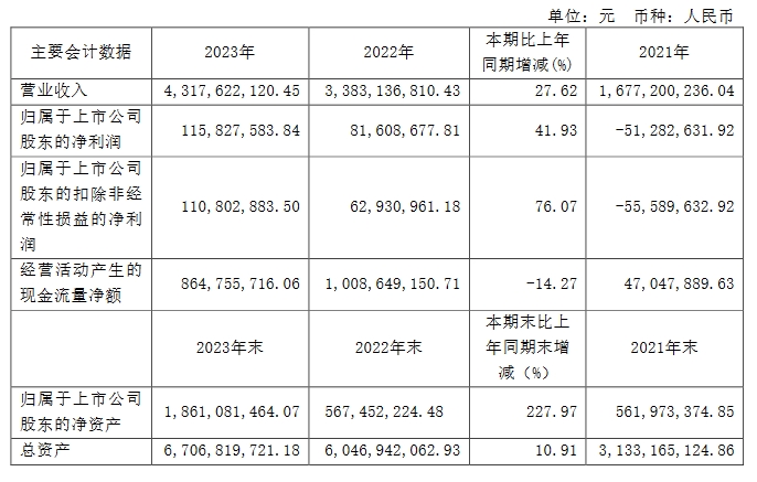 安徽安孚电池科技股份有限公司(以下简称安孚科技,603031.SH)于近日公布了2023年全年财报。公司实现营业收入431,762.21万元,较上年同期增长27.62%;实现归属于上市公司股东的净利润为11,582.76万元,较上年同期上升41.93%,实现归属于上市公司股东的扣除非经常性损益的净利润为11,080.29万元,较上年同期上升76.07%。