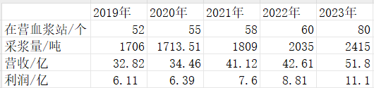 统计天坛生物近五年的在营浆站数量、采浆量以及营收、净利润可以发现,天坛生物的业绩随着在营浆站的数量、采浆量的上升而上升。尤其是2023年,天坛生物的在营浆站和采浆量都有明显突破,天坛生物的业绩也上了一个台阶。