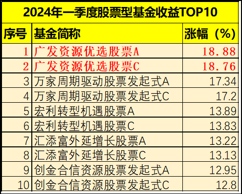 以股票型基金盈利TOP10看,广发资源优选股票A收益最高,涨幅18.88%;创金合信资源股票发起式C收益12.8%,排名第10。
