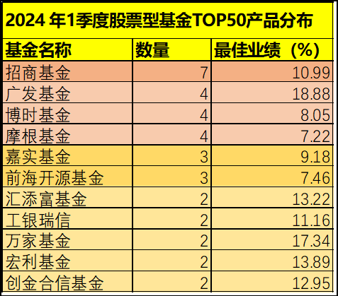 为了更好地反映一季度股票型基金投资情况,我们进一步放大样本,选取全部股票基金一季度收益TOP50产品来分析。这些产品,大约占812只股票型基金的6%,属于这类产品一季度的大赢家。这些头部产品数量多寡,自然反映了一家基金公司的投资实力(指数型、混合型基金以此类推)。