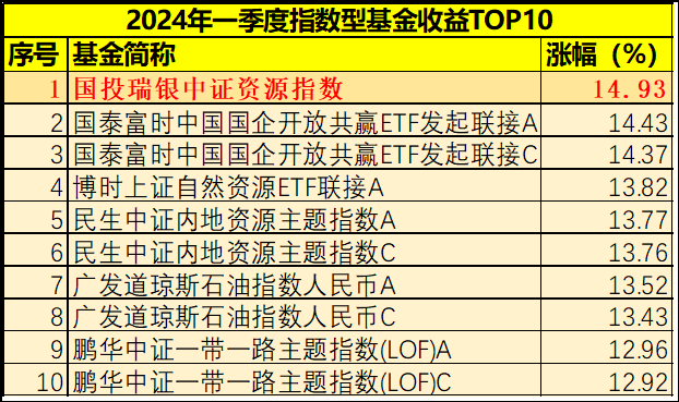 02、指数型基金:一季度1113只盈利,国投瑞银中证资源以14.93%领涨
