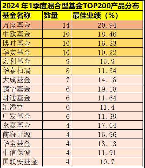 从混合型基金收益TOP200产品归属看,产品4只以上(含4只)基金公司有16家,产品总计112只,占比56%。