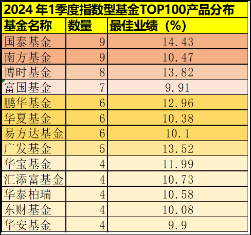 指数型基金收益TOP100产品中,数量居前的公司几乎都是头部基金公司,只有东财基金公司属于例外。