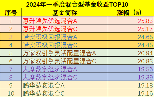 以混合型基金一季度盈利TOP10看,惠升领先优选混合A最高,盈利25.83%;事实上,惠升基金、诺安基金、万家基金、摩根士丹利基金、鹏华基金,这5家基金公司各有2只产品瓜分了前10。