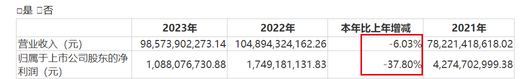 和业绩下滑幅度相比,这一数据还算平稳。财报显示,2023年,公司实现营业收入985.74亿元,同比下滑6.03%。