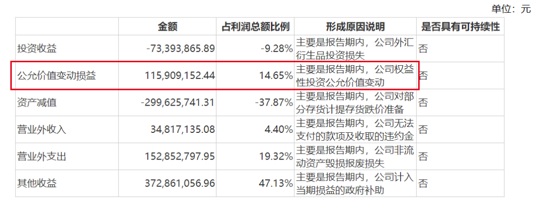 而这些公允价值变动收益占了利润总额的14.65%。换句话来说,歌尔股份有超14%的利润总额存在于账面之上。