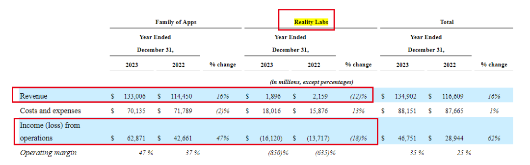 Meta发布的财报显示,截至2023年12月31日,被寄予厚望的元宇宙项目Reality Labs实现收入18.96亿美元,同比下滑12%;利润亏损161.20亿美元,同比扩大18%。