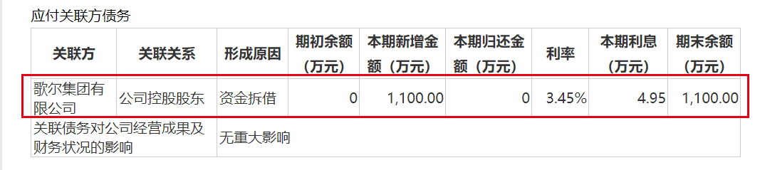 「子弹财经」注意到,当前歌尔股份手中有上百亿资金且有意将大额资金用来购买理财,却在报告期内向控股股东歌尔集团拆借了1100万元,利率为3.45%。