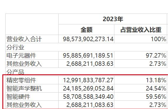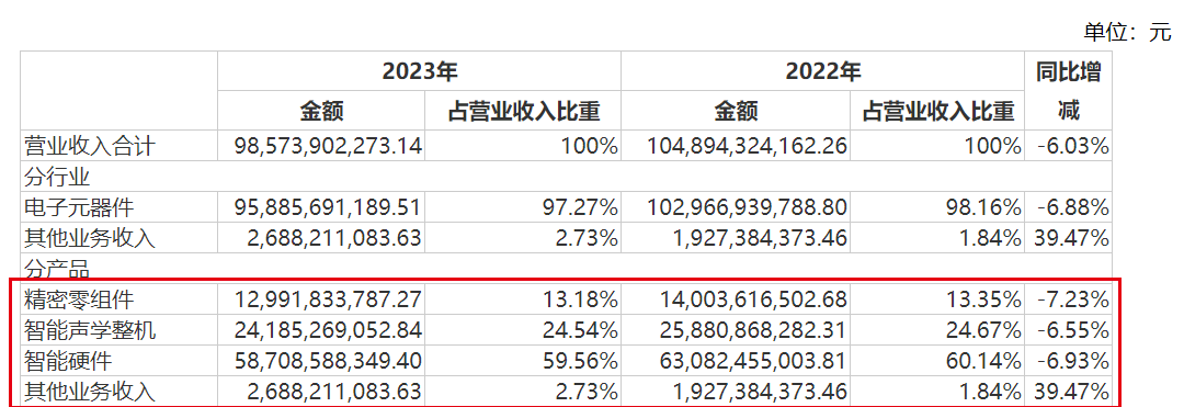 财报显示,2023年,歌尔股份的智能硬件营收达到587.09亿元,占营业收入的比例达到了59.56%,相比之下,过去的营收“重头戏”智能声学整机业务(包括苹果产品)占比仅为24.54%,业务重心已明显偏移。