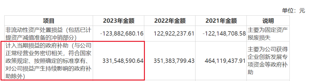 2023年财报显示,计入当期损益的政府补助高达3.32亿元。这也意味着,企业约3成归母净利润实际上是来自于政府补助。