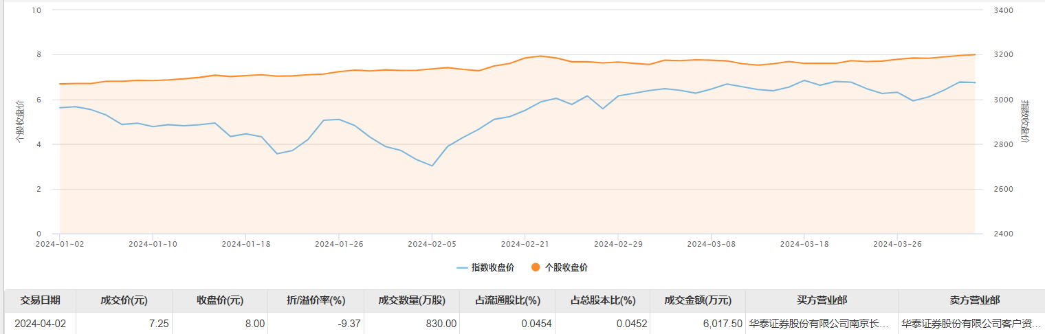 江苏银行4月2日大宗交易成交830万股,成交额6017.5万元,占当日总成交额的6.98%,成交价7.25元,较市场收盘价8元折价9.37%。