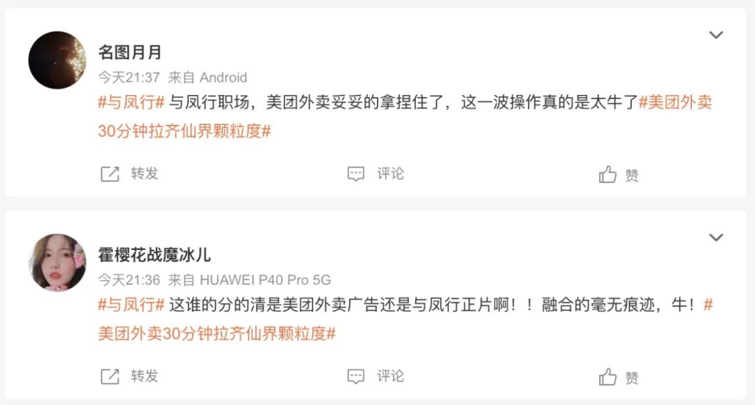 除了开头所提讨论度颇高的百花宴,当《与凤行》行止和碧苍王沈璃为保护灵界疑似葬身东海的催泪剧情时,观众们为女主落泪、担忧在社媒平台齐发感悟小作文的时间点,美团外卖也精准选中了该剧情爆点投放了相关素材。