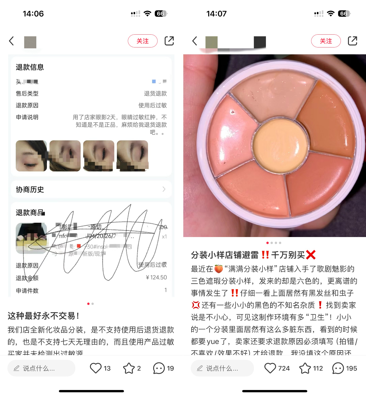 在小红书上,有关分装小样的避雷贴也比比皆是,有用户称,买的分装眼影使用后过敏红肿,也有用户表示,在分装遮瑕里看到了头发丝和虫子。因店家曾称分装产品概不退换,加上维权流程复杂,不少消费者选择吃下哑巴亏。