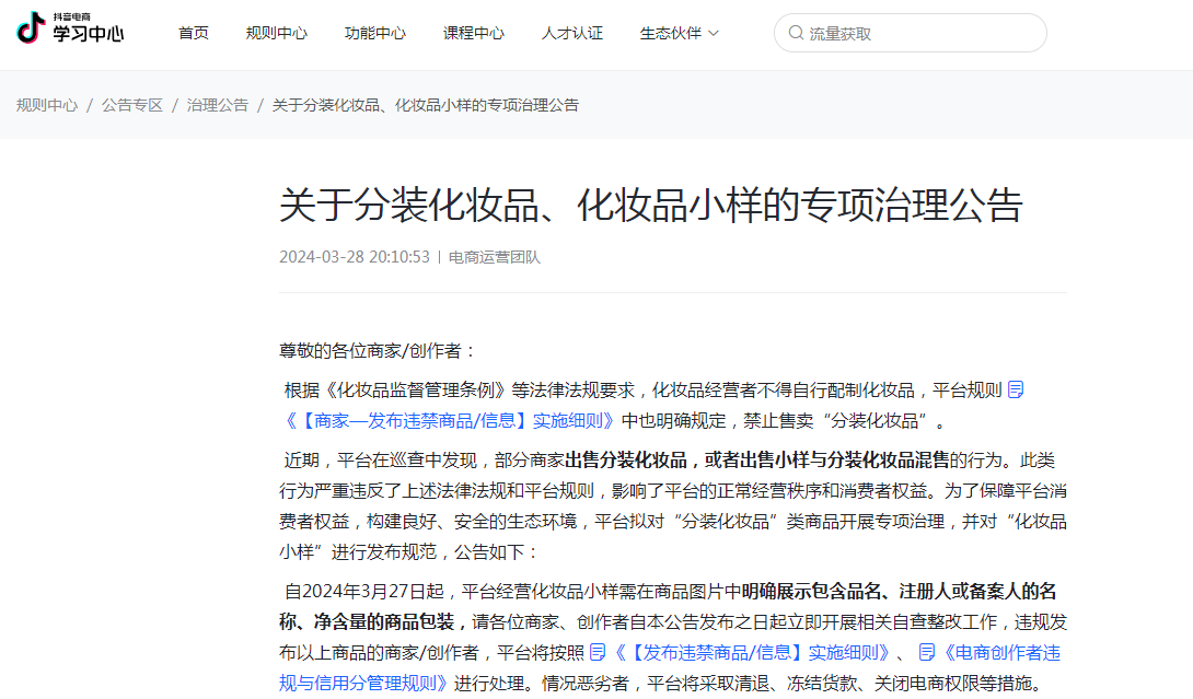近日,抖音发布《关于分装化妆品、化妆品小样的专项治理公告》(下称公告),明确表示禁止售卖分装化妆品,并拟对“分装化妆品”类商品开展专项治理。