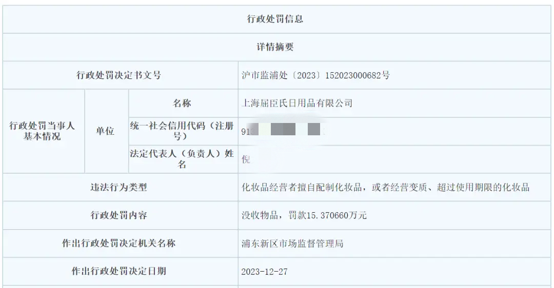 另据国家企业信用信息公示系统,2019年,上海一企业因在其经营场所内开展香水小样分装活动,并在拼多多销售其自行分装的39种香水小样,被上海市松江区市场监管局处以5万元的行政罚款。而去年,屈臣氏日用品有限公司也因擅自分装化妆品,且无中文标签,被上海市浦东新区市场监管局罚款15.37万元。