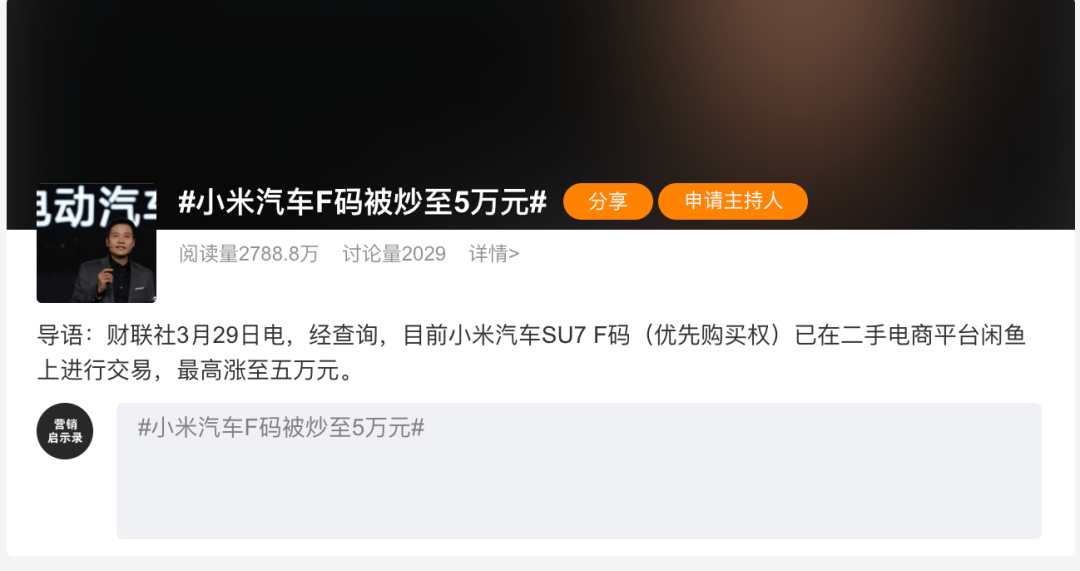 这一原理也被巧妙地应用到了小米SU7的销售之中。大家都知道小米SU7初期肯定产能不足,这就创造了产品的稀缺性,还在消费者之间创造了一种紧张感和急迫感,当产品放出时,消费者会竞相下订单,希望能成为最早的拥有者之一。那些下定的人在社交媒体上晒的行为又引发了其他人抢购。