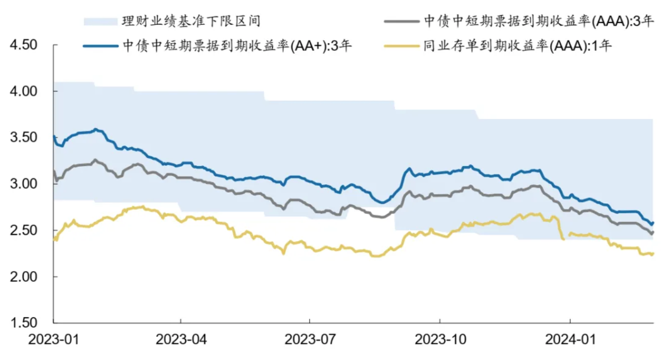 从业绩比较基准来看也是一样的情形,国投证券统计,截至今年3月末,存量产品规模居首的股份行理财子公司新发纯固收类理财业绩基准下限已经降至新低2.75%。虽然近期多家银行理财公司陆续下调旗下产品的业绩比较基准,但是从数据来看,还是跟不上资产端收益率的下降,形成了倒挂。