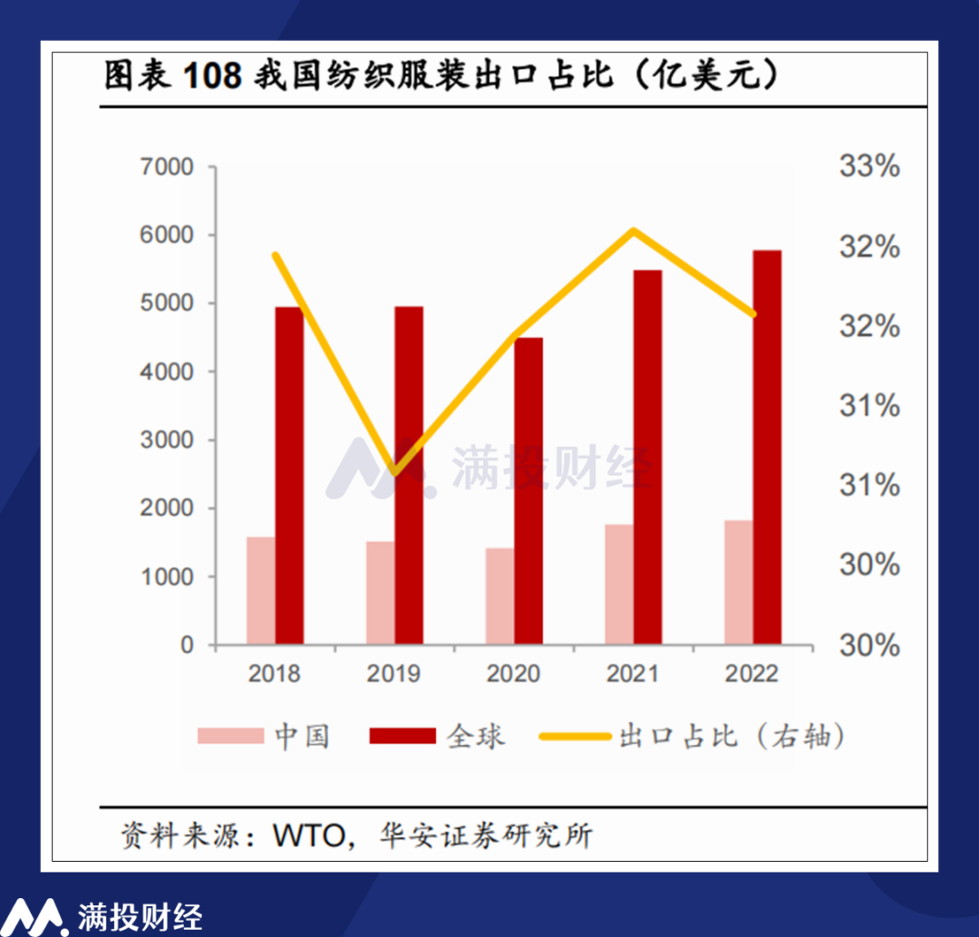 另一方面,2015年以来,伴随着国内纺织业对落后纺织产能的清退,以及相关产能向东南亚进行产业转移的影响,国内纺织服装、纺织服饰业的利润率整体出现了弱化。但时至今日,中国依旧是全球第一大纺织服饰制造大国。截至2022年,我国服装出口额在全球服装出口中占比达到32%。