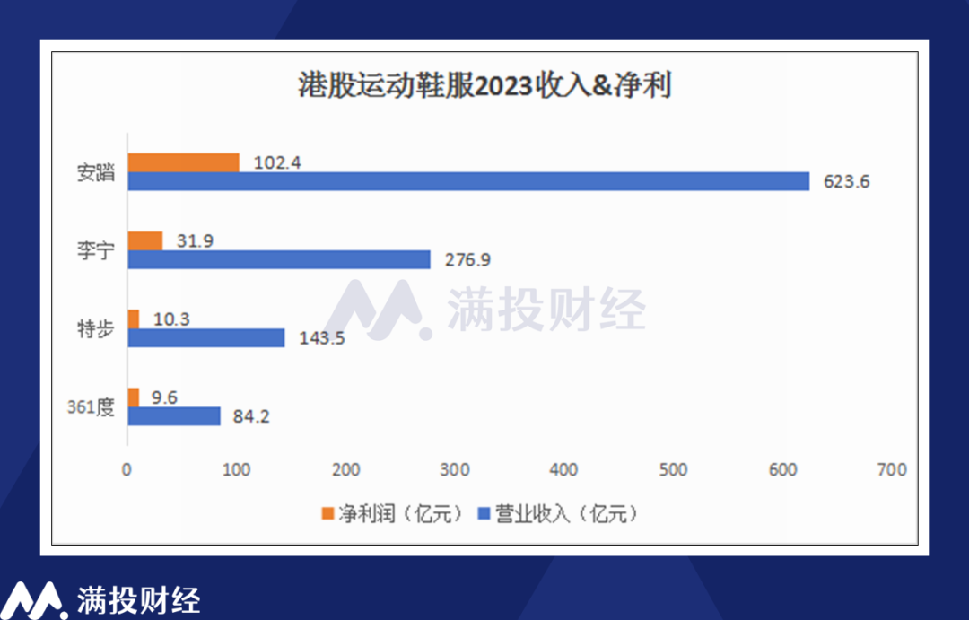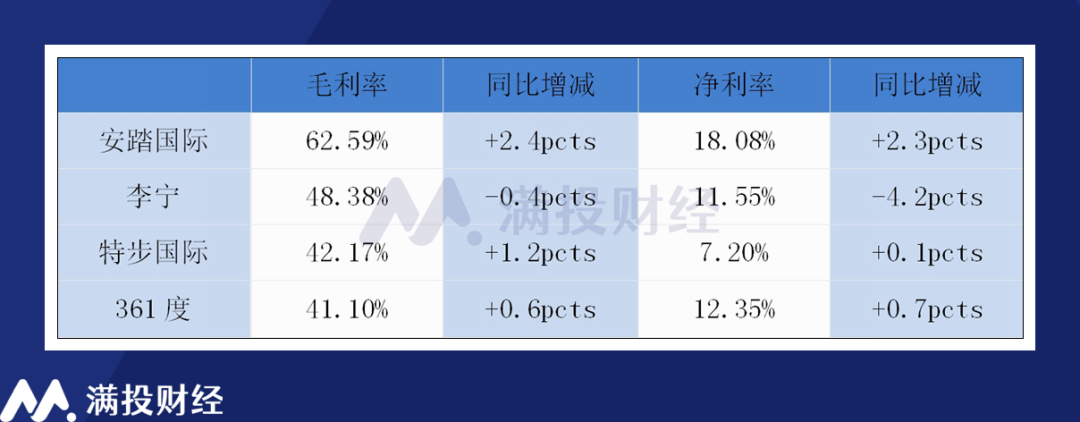 而相对来说体量较小的361度和特步国际,则因为以低线城市作为主阵地的特征而获得了较好的流水增速。但就上述四家公司来说,其营收规模的分段是比较明显的,百亿级的特步、361度,往上到200亿营收的李宁,再往上到600亿的安踏,其营收规模的分段差距明显。