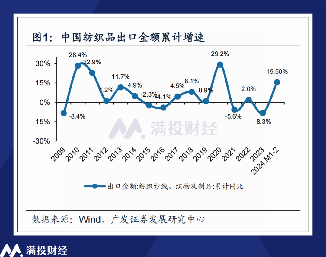 另一方面,海外需求额回暖也有望成为纺织品估值走强的因素。根据海关总署统计,2024 年 1-2 月纺织品出口金额(美元计)同比增加 15.5%。2024 年 1-2 月服装出口金额(美元计)同比增加 13.1%。根据国家统计局统计,2024年1-2月限额以上企业服装鞋帽针纺织品零售额同比增长1.9%;穿类商品网上零售额同比增加17.8%。