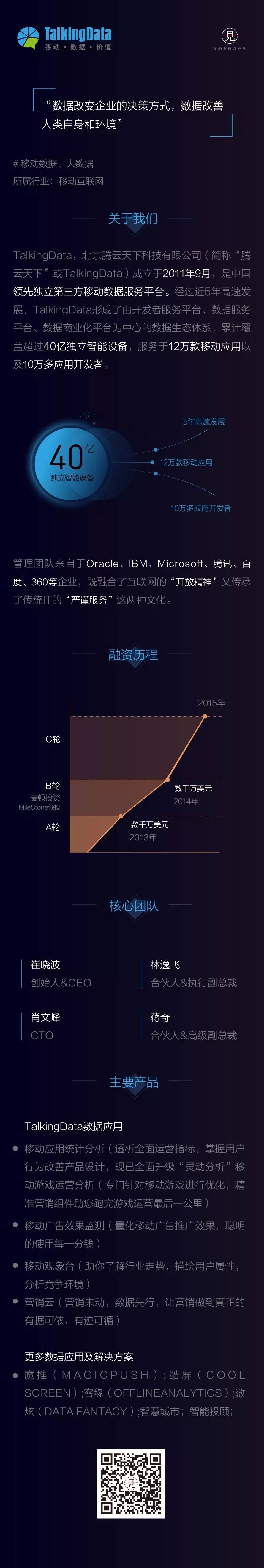 1.成长迅速,前景广阔。TalkingData成立于2011年9月,伴随大数据浪潮,已成为国内最大的独立第三方移动数据服务品牌,累计覆盖超过40亿的独立智能设备。。在完成C轮融资后,估值10亿美金,已超过国外同类领先公司Flurry。