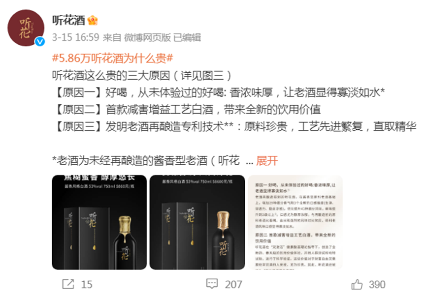 与同样在3·15晚会被曝光的其他品牌相比,听花酒的反应速度格外快,他们甚至在晚会开始前几小时就试图用自夸的方式洗白。其官方微博上次发文还是1月23日,3月15日当天却在16:59和18:06连续发博,并带上了#5.86万听花酒为什么贵#和#5.86万听花酒为什么这么好喝#的话题。