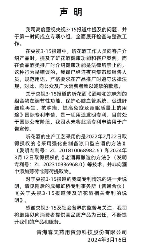 听花酒此时再次展现了自己不走寻常路的风格,他们在3月16日清晨6点多发表声明,表示对央视报道高度重视,已成立专项小组展开检查和整改。但声明将问题全部归结于销售,坚称产品工艺毫无问题。