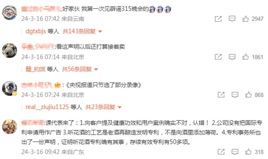 这样的操作惊呆了网友,听花酒也被网友封为有史以来第一个硬刚3·15晚会的品牌。