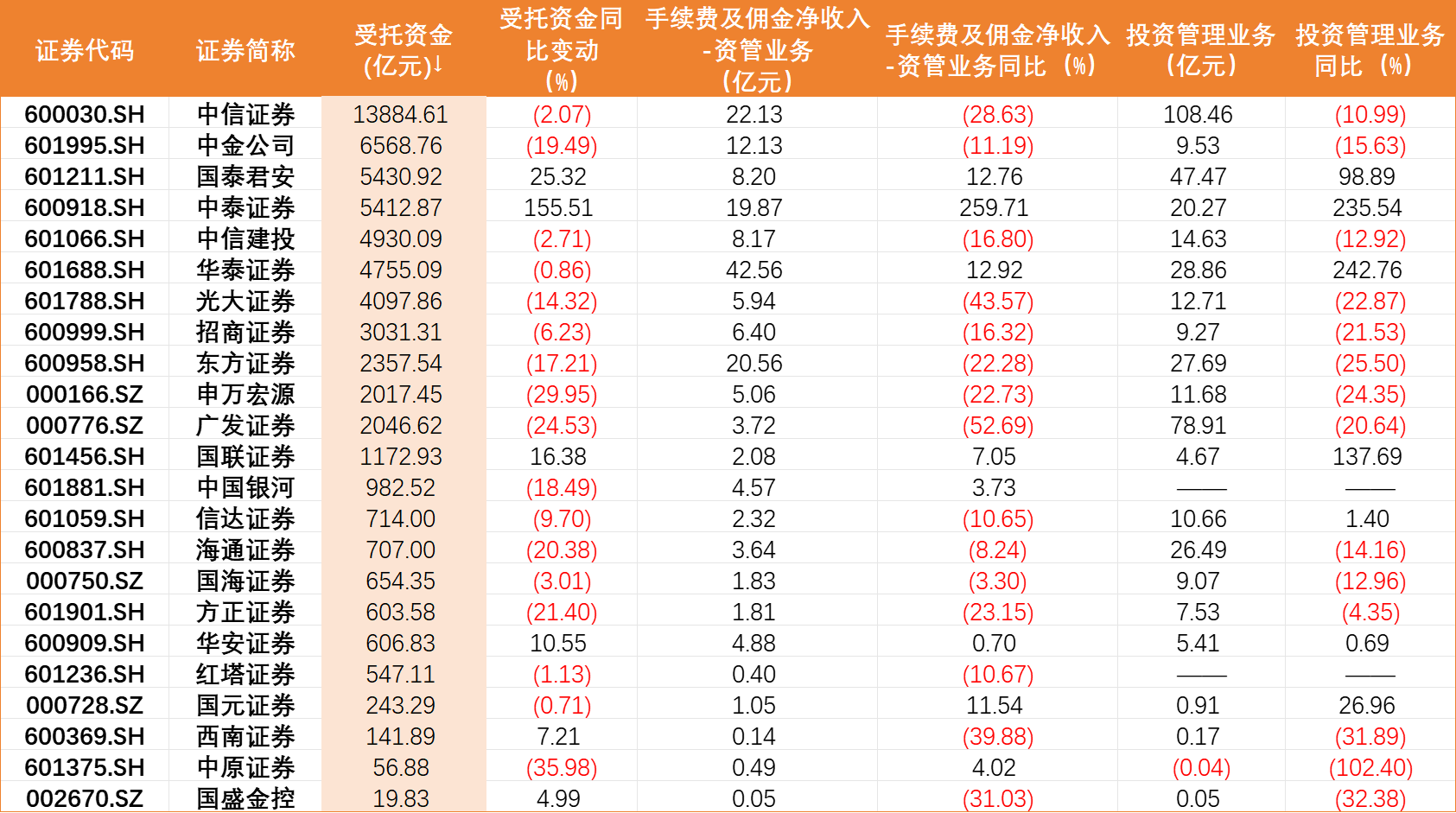 国泰君安、中泰证券、华安证券、西南证券和国盛金控期内受托资金规模均录得增长,其中,国泰君安和中泰证券同比增速高达25.32%和155.51%。