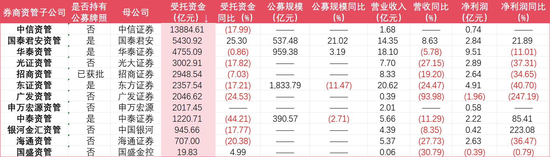 Wind统计,截至目前,23家被统计券商的“手续费及佣金净收入:受托客户资管业务”(下称:资管净收入)合计177.84亿元,同比下滑5.3%;更进一步,有可比数据统计券商资管子公司(不含2023年开业的申万宏源资管和中信证券资管)营业收入合计82.24亿元,同比下滑22.24%。