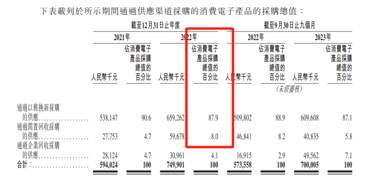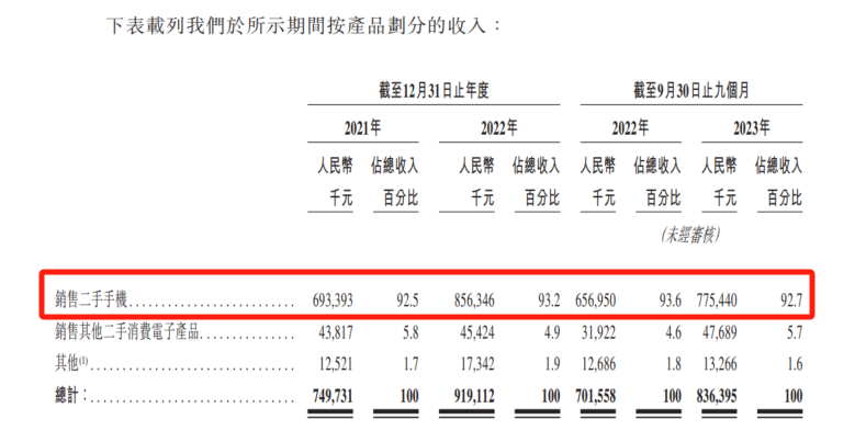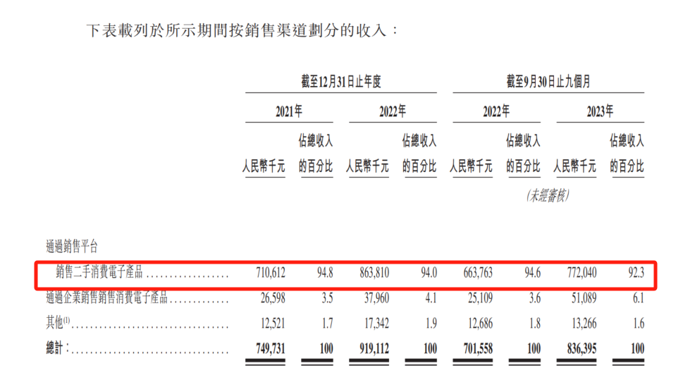 《招股书》显示,2021年、2022年及2023年前三季度,公司通过销售平台销售二手消费电子产品的收入占比均超9成。