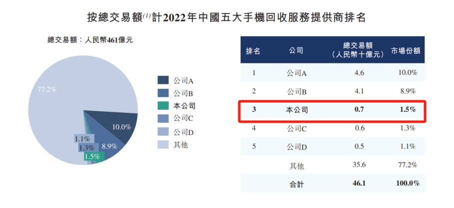 据《招股书》显示,闪回科技是中国最大的专注于线下以旧换新的手机回收服务提供商,也是中国第三大手机回收服务商,市场份额分别约为8.4%及1.5%。