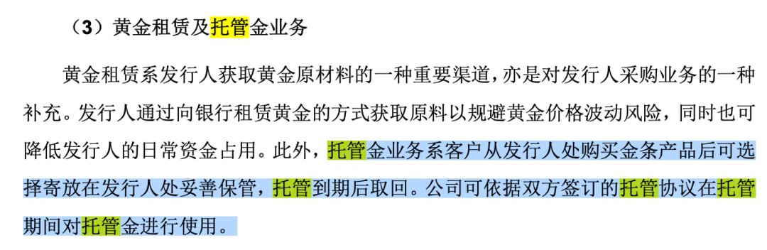 然而,从《招股书》来看,中国黄金本身也是有“托管业务”的。《招股书》显示,托管金业务是客户从中国黄金处购买金条产品后可选择寄放在中国黄金处妥善保管,托管到期后取回。公司可依据双方签订的托管协议在托管期间对托管金进行使用。