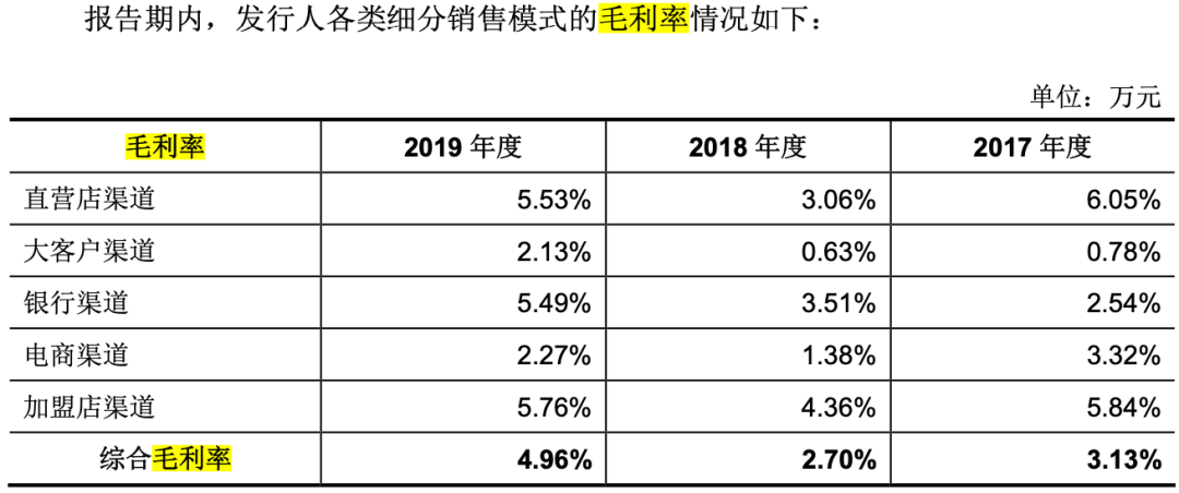 而从细分领域来看,其直营店渠道、加盟店渠道、银行渠道的毛利率相对较高一些,而电商渠道在上述同期的毛利率只有3.32%、1.38%、2.27%。大客户渠道的毛利率更低,在2017年和2018年甚至只有不到1%。