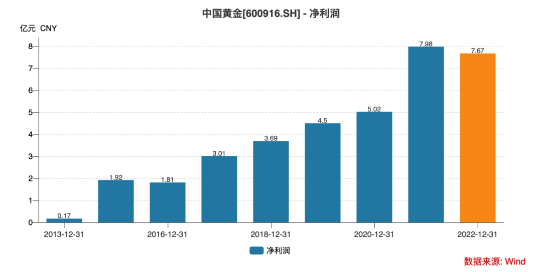 在这一背景下,虽然中国黄金收入可观,2021、2022年分别为507.58亿元和471.24亿元,但净利润均不足8亿元。