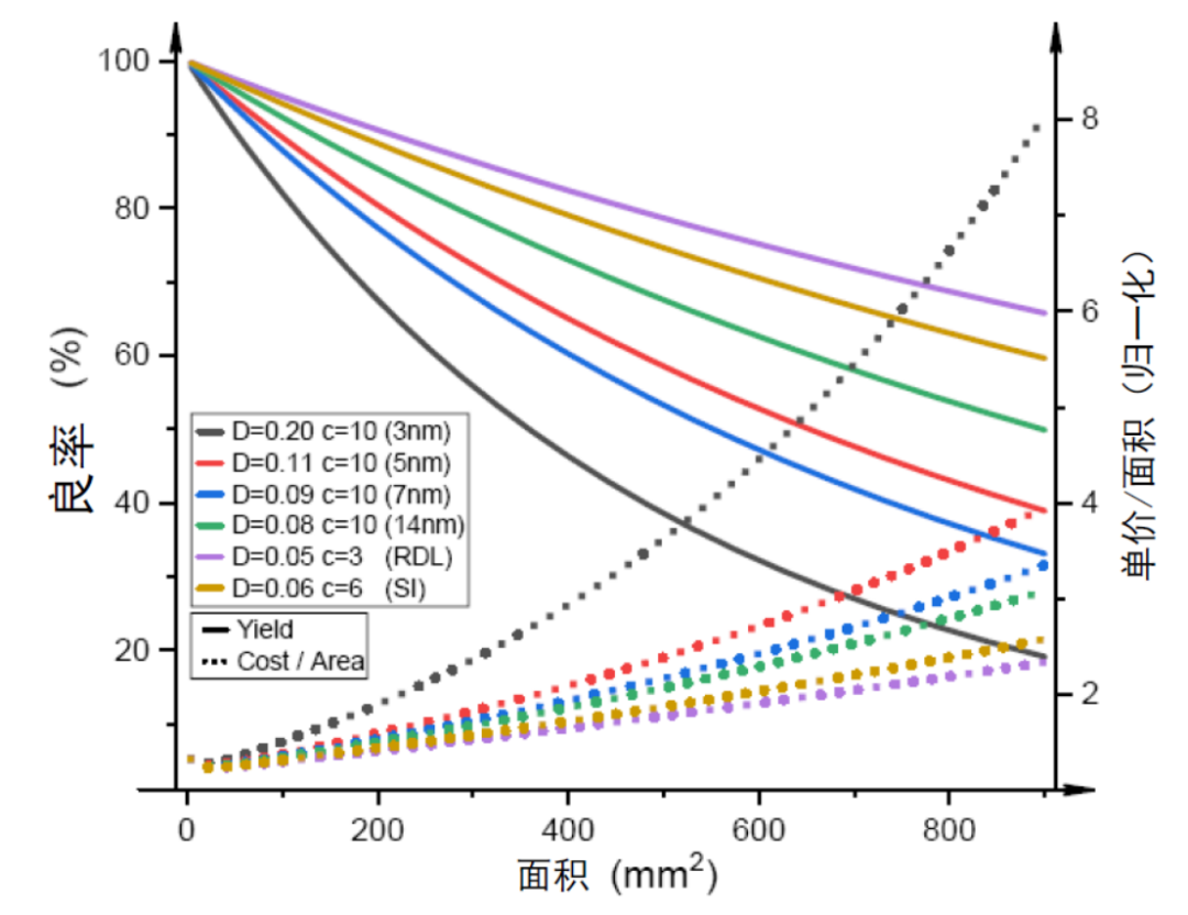 不同制程及封装技术下的芯片良率、成本、面积的关系 注:D为缺陷密度,c为负二项分布中的集群参数或Seed’s model中临界值数量
