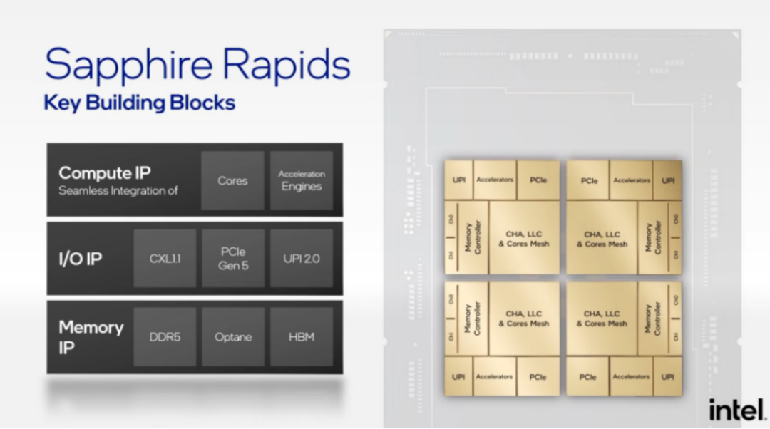 具体来看,通过两组镜像对称的相同架构的building blocks,组合4个Chiplets,获得4倍的性能和互联带宽。每个基本模块包含计算部分(CHA &LLC &Cores mesh, Accelerators)、memory interface部分(controller, Ch0/1)、I/O部分(UPI,PCIe)。通过将上述高性能组件组成基本的building block,再通过EMIB技术进行Chiplet互联,可以获得线性性能提升和成本收益。