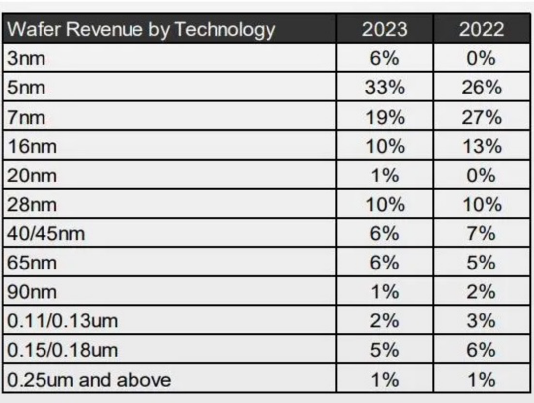3nm制程技术占据了台积电晶圆总收入的6%,5nm和7nm分别占晶圆总收入33%和19%。先进制程(7nm及以下)占台积电晶圆总收入的比重达到了58%。