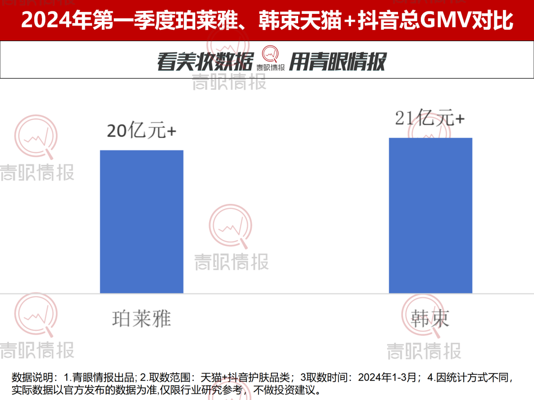 据青眼情报最新数据显示,2024年第一季度,韩束在天猫和抖音两大主要电商平台总GMV(商品交易总额)达21.86亿元,超过了珀莱雅的20.09亿元。其中,仅抖音平台就为韩束带来了20.07亿的GMV。