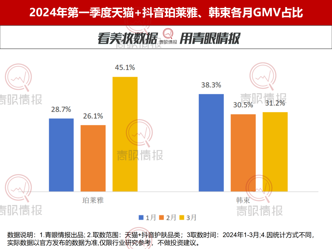 另通过月份来看,韩束2、3月整体GMV表现虽不及1月,但3月开始GMV已有重新上涨之势。同样,珀莱雅3月GMV占第一季度总GMV的45.1%,也反映出其强劲的增长势头。此外,分平台看,珀莱雅天猫GMV是抖音的1.64倍;而韩束抖音GMV则是天猫的11.2倍。
